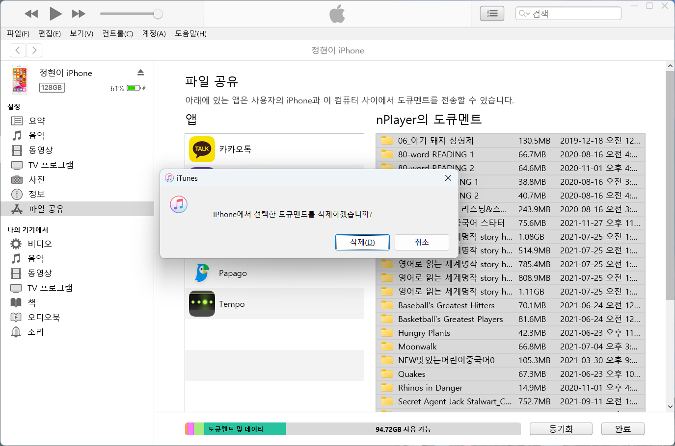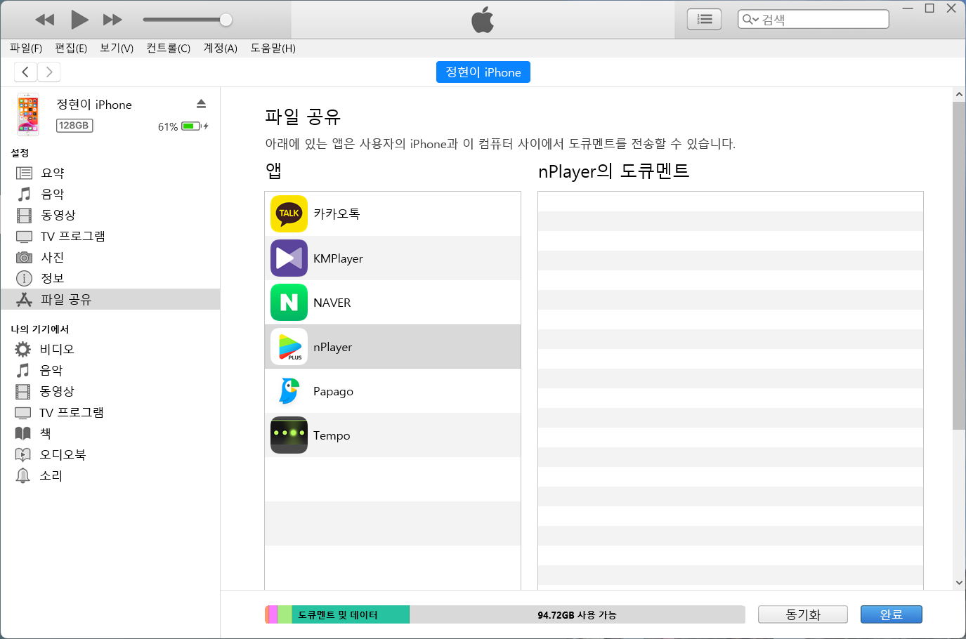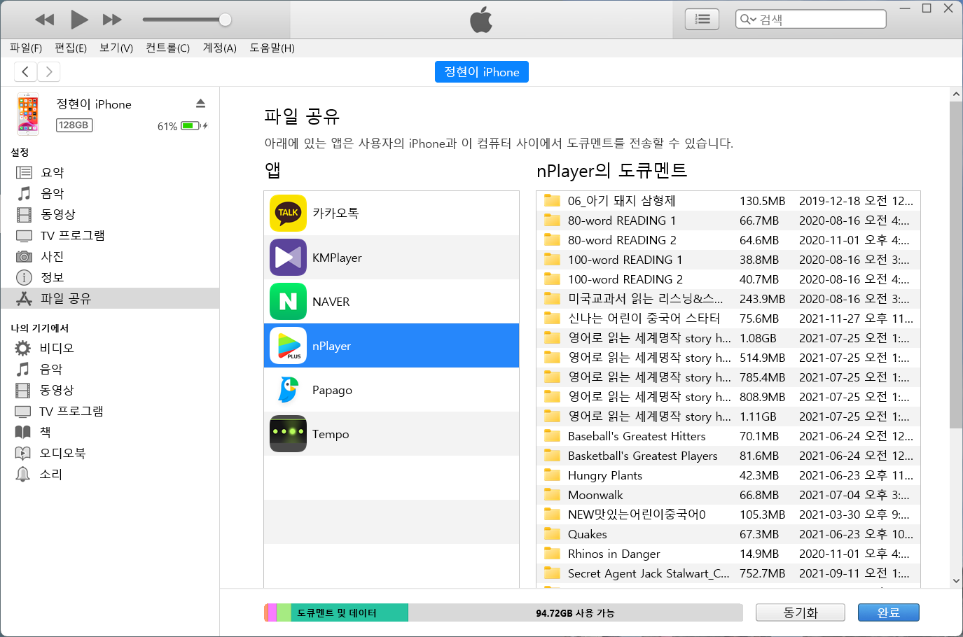 | 그러다 원인을 알아내고 해결을 했는데요, 아이폰을 백업한 내용에 앱내에 저장된 파일이나 폴더의 이름이 한글이었던 겁니다. 컴퓨터를 사용하다보면 종종 한글명으로 했을 때 충돌이 발생하는 경우가 있는데, 이 역시 그런 케이스였고, 애플에서 이런 부분까지 수정을 안해두고 있네요. 어쨌든 전 필요가 없는 파일이라 nPlayer 앱에 있는 한글로 된 폴더를 모두 삭제해주었습니다.