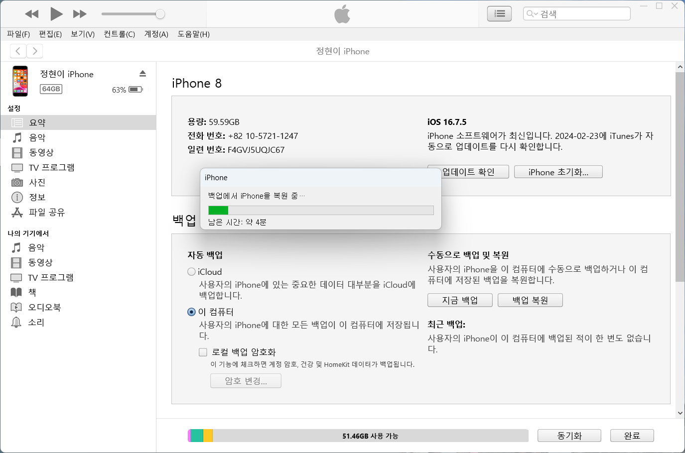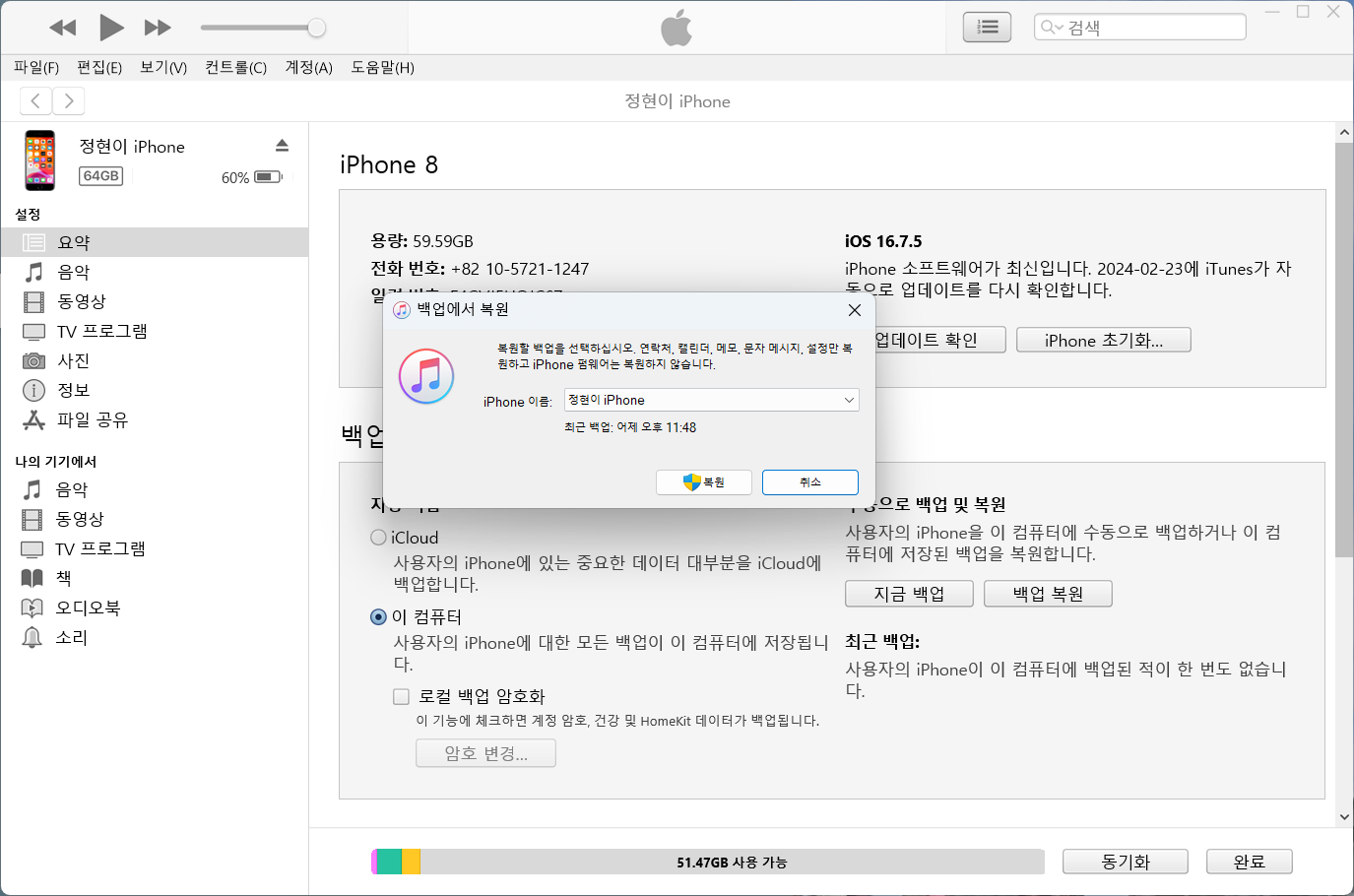 ※ 전 백업을 할때 '이 컴퓨터'에 하는 편이고 로컬 백업 암호화를 체크하고 백업합니다. 그래야 앱의 계정관련된 내용까지 복원이 되니까요