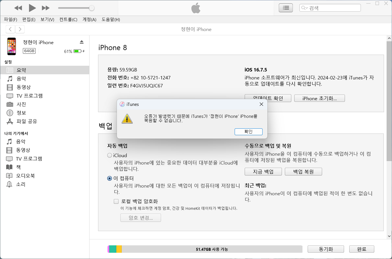 해결방법 : 오류가 발생했기 때문에 iTunes가 iPhone을 복원할 수 없습니다.