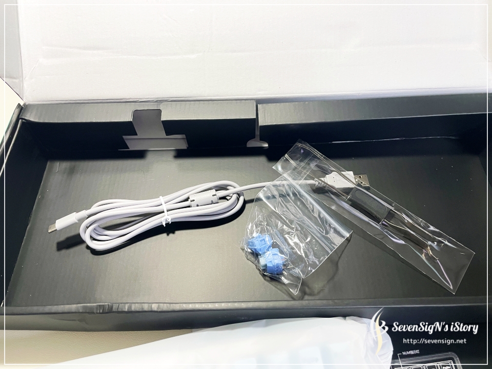 | 구성품으로는 설명서와 함께 케이블이 포함되어 있고, 핫스왑이라 그런지 여분의 스위치도 포함이 되어있습니다. 그리고 키캡과 스위치 리무버도 있구요.