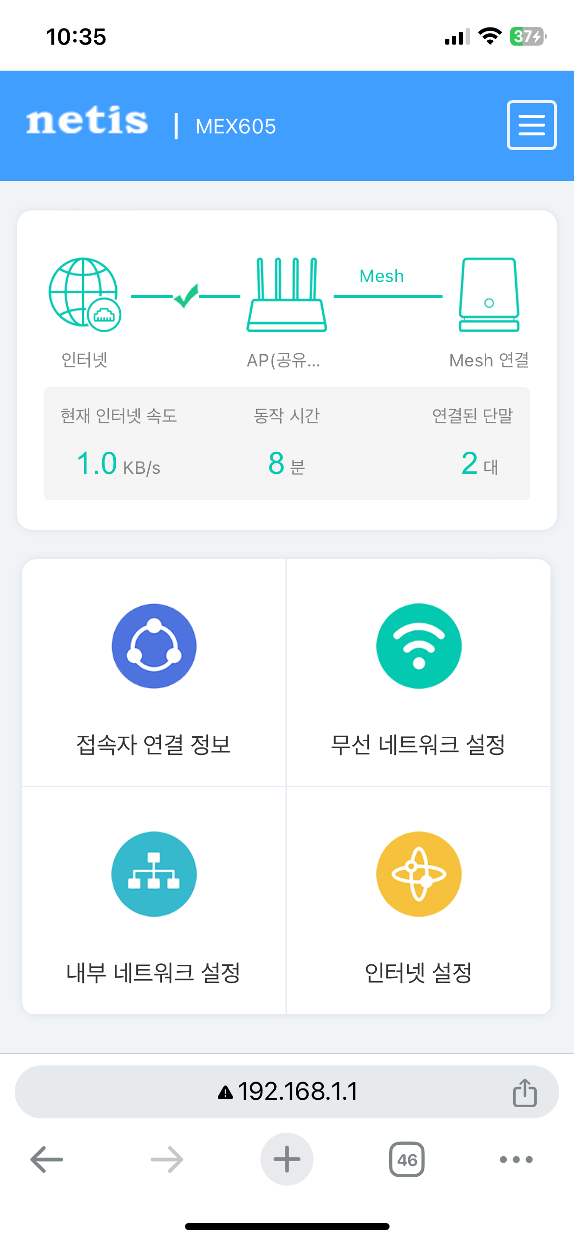 | 현재 인터넷 연결 상태 및 연결 기기도 확인할 수 있고, 우측의 메뉴 버튼을 누르면 다양한 고급설정을 통해 공유기 환경설정을 조작할 수 있습니다.