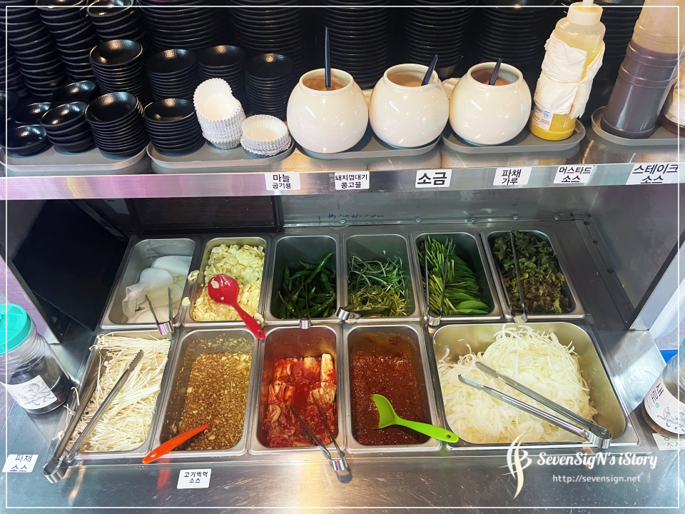 야채와 마늘, 소스 등등 양껏 가져다 먹을 수 있어 좋구요.