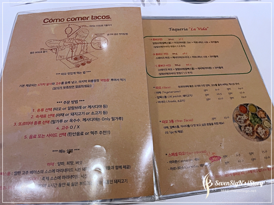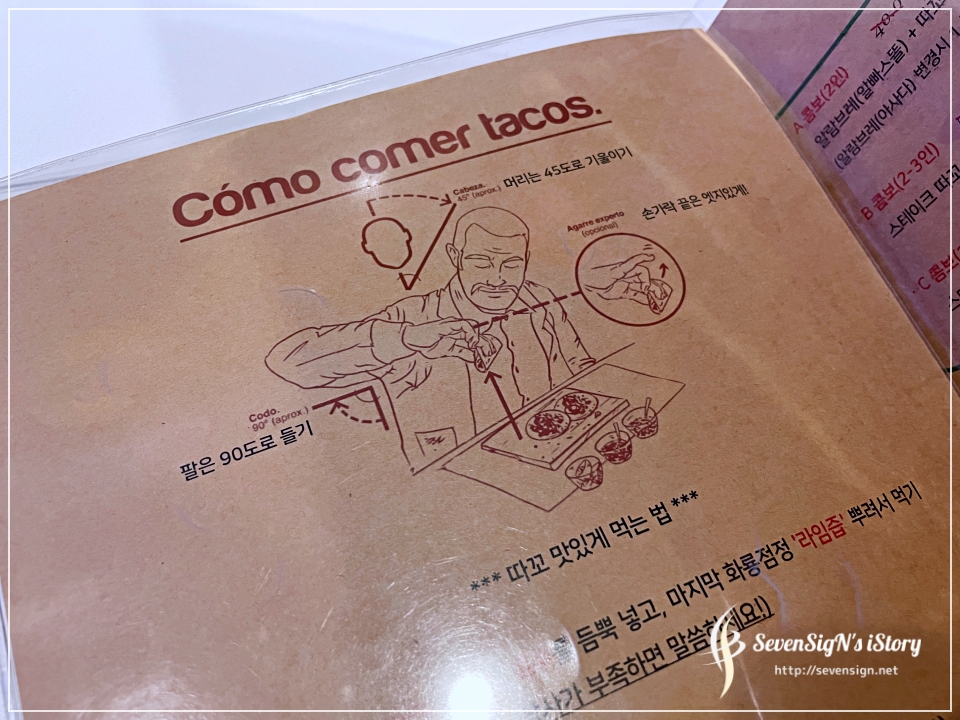 테이블에 앉으면 따께리아 라 비다에서 맛있게 먹는 법이 있는데