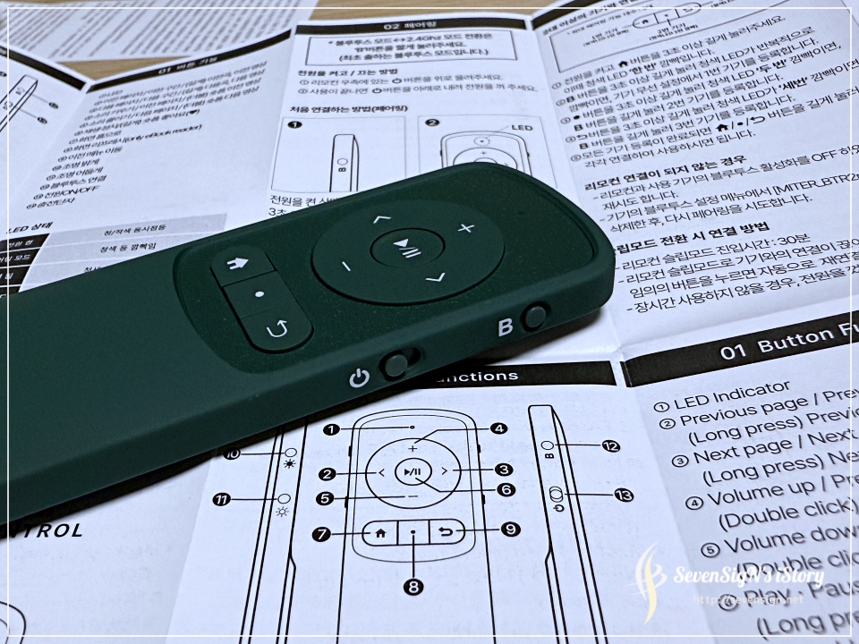 | 오른쪽 측면에는 전원버튼과 B버튼이 있는데 B 버튼을 누르고 있으면 블루투스 페어링을 할 수 있습니다. 미테르 리모콘을 최대 3대까지 멀티페어링도 되기 때문에 별도의 OTT 기기나 맥북 등의 기기와도 페어링해두면 미테르 리모콘 하나로 3대까지 이용할 수 있습니다.