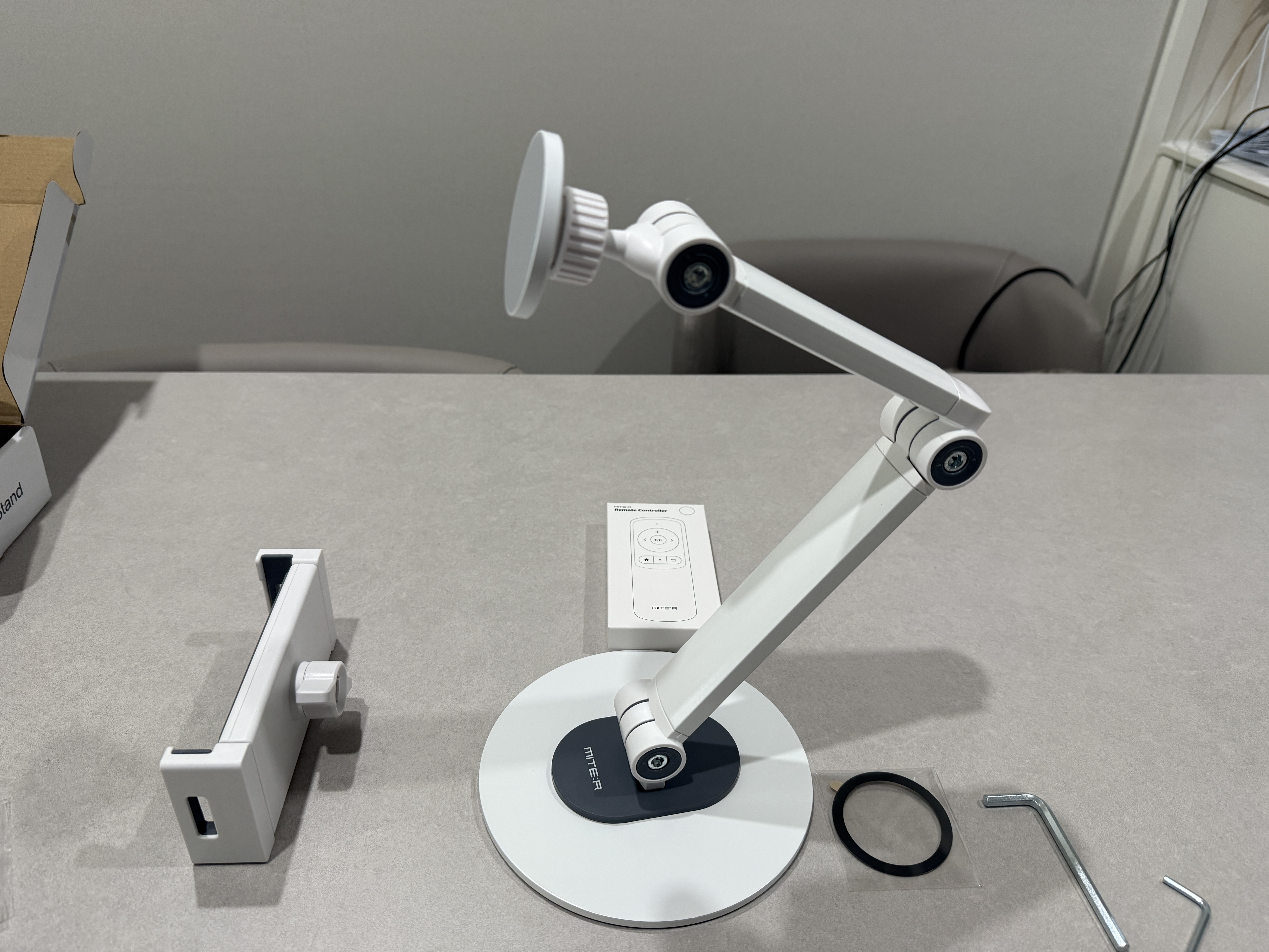 | 패키지를 개봉하면 아래와 같이 구성이 되어 있어서 직접 조립해야 합니다. 미테르 블루투스 리모콘은 별도로 구매할 수 있구요.
