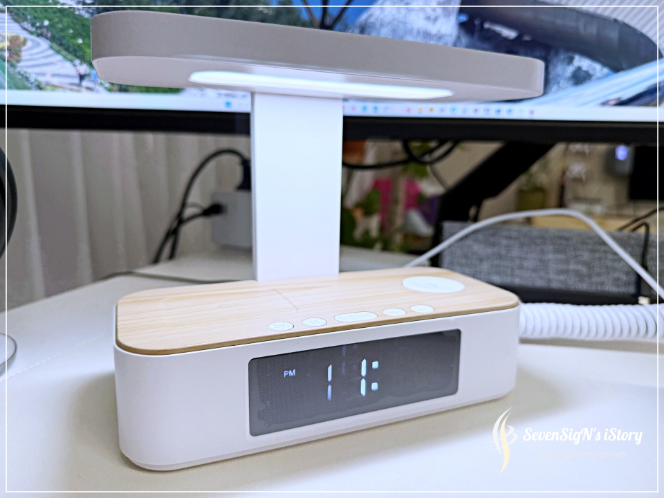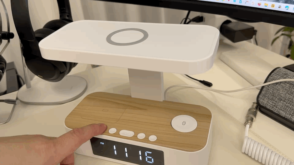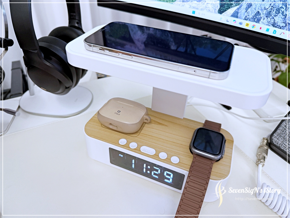 |  정면에서 보면 아래쪽에 커다란 LCD가 있어서 전자시계를 확인할 수 있고, 아이폰 중전패드가 위로 배치된 것을 확인할 수 있습니다. 하단 부 우측에는 애플워치 충전기가 있고, 왼쪽에는 무선충전을 지원하는 에어팟을 위한 공간이 마련되어 있습니다.
