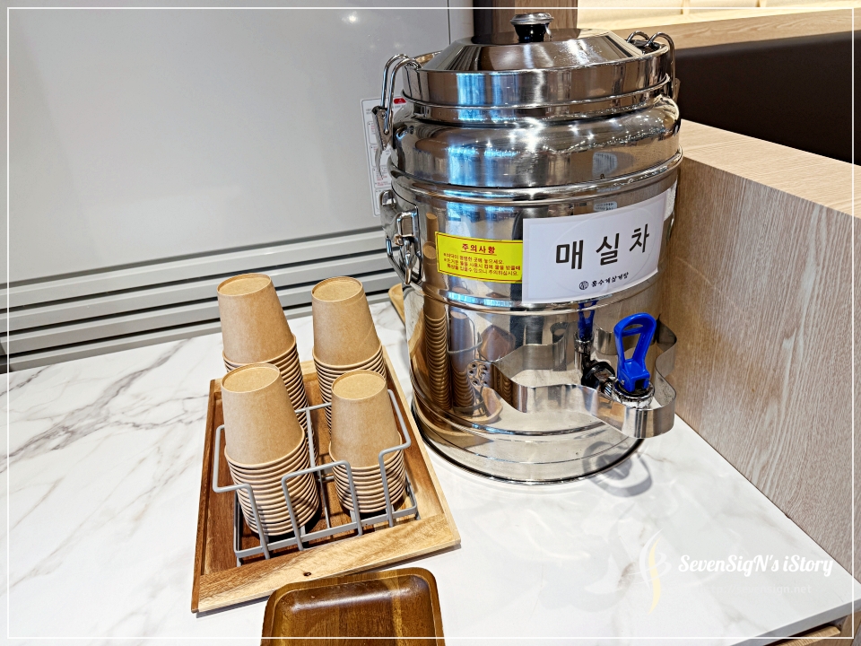 한쪽에 매실차와 생수도 준비되어 있습니다.