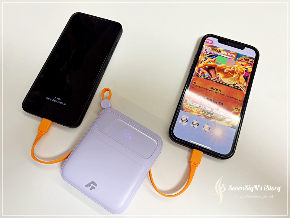 | 케이블이 두 개 달려 있는 만큼 동시에 두 대의 기기를 충전할 수도 있어요. KC 인증을 받은 배터리라 정격 용량 기준으로 안정적인 충전이 가능하다는 점도 마음에 들었어요. 실제로 갤럭시25와 아이폰12프로를 동시에 연결해봤는데 문제없이 잘 충전되더라구요. 기종 상관없이 사용할 수 있다는 점이 확실히 장점이에요. 이 보조배터리 하나만 챙겨도 여러 기기를 커버할 수 있어서 짐을 줄일 수 있겠네요.
