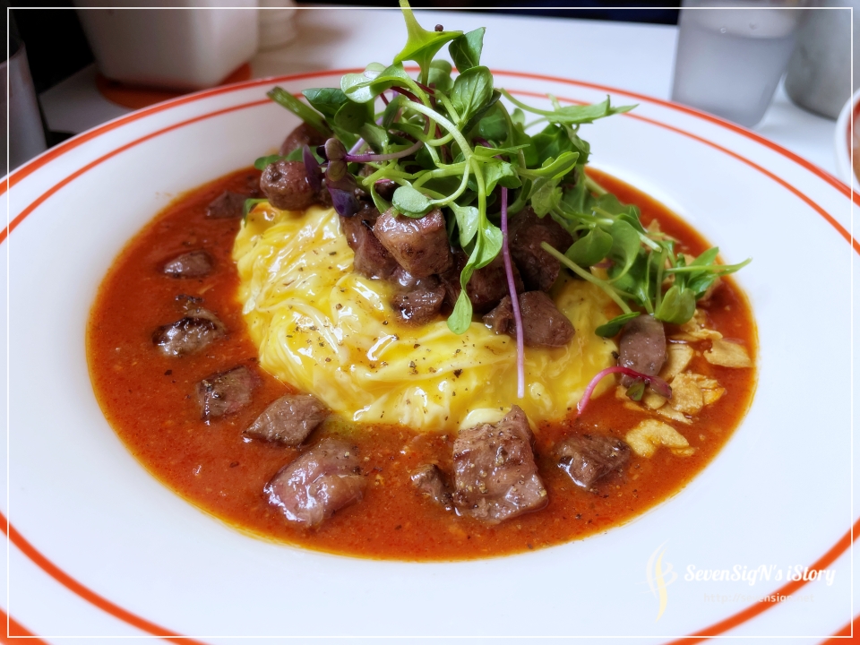 먼저 부채살 스테이크 오므라이스가 나왔네요.