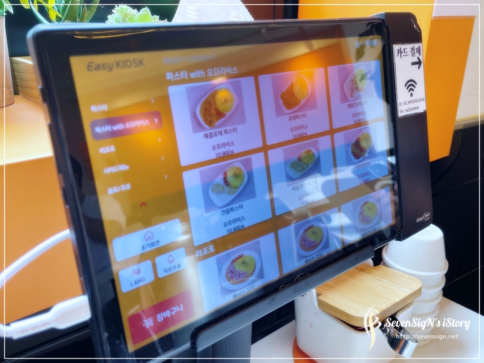 오므파탈에는 테이블마다 이렇게 터치디스플레이가 설치되어 있어서 이걸로 주문을 하면 됩니다.